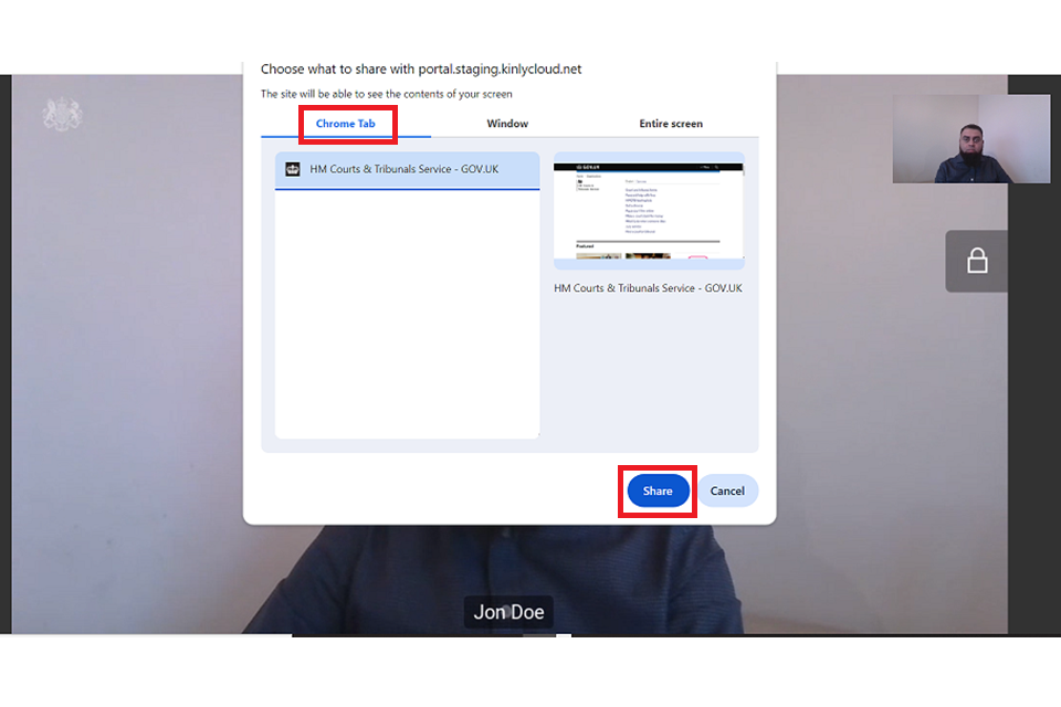 Share a chrome tab if you only want to share one tab within your browser window. The other people in the video hearing will not be able to see other browser tabs or any other applications.