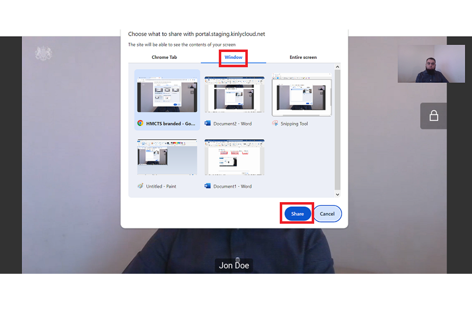 Share a window if you are only sharing items from one format. For example, if you are only sharing documents, you can share your Microsoft Word window and move between documents. Or if you are sharing more than one website, you can share your browser window and move between tabs. The other people in the video hearing will only be able to see items in the selected application.