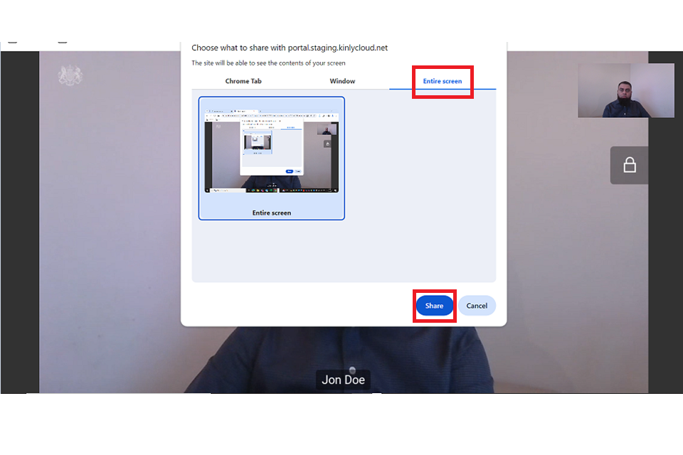 1. Select ‘Entire screen’. If you have 2 screens you will be able to choose which one to share. Choose the appropriate screen and then select ‘Share’.