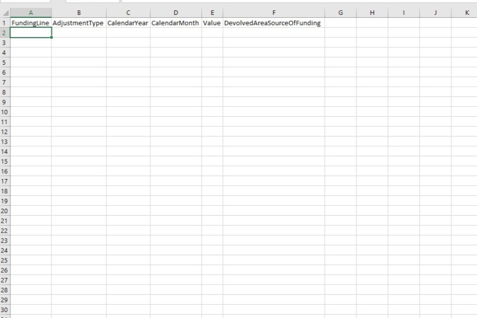 For each row in your CSV file, you should use a unique combination of FundingLine, AdjustmentType, CalendarMonth, CalendarYear and DevolvedAreaSourceOfFunding, as shown in diagram 1.