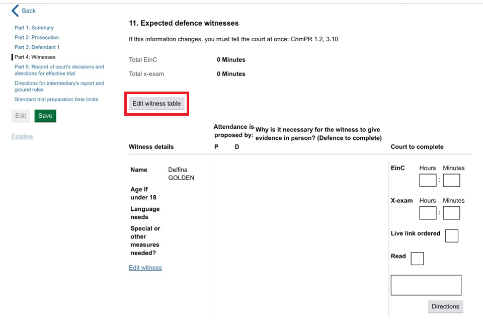 1. To add or edit a witness, select the ‘Edit’ button and open the witnesses section. Then scroll to ‘Expected defence witnesses’ and select ‘Edit witness table’.
