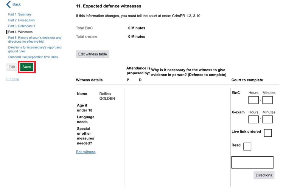6. The witness will now appear in the defence witness table. To save all of your changes you must select ‘Save’ in the left-hand menu.