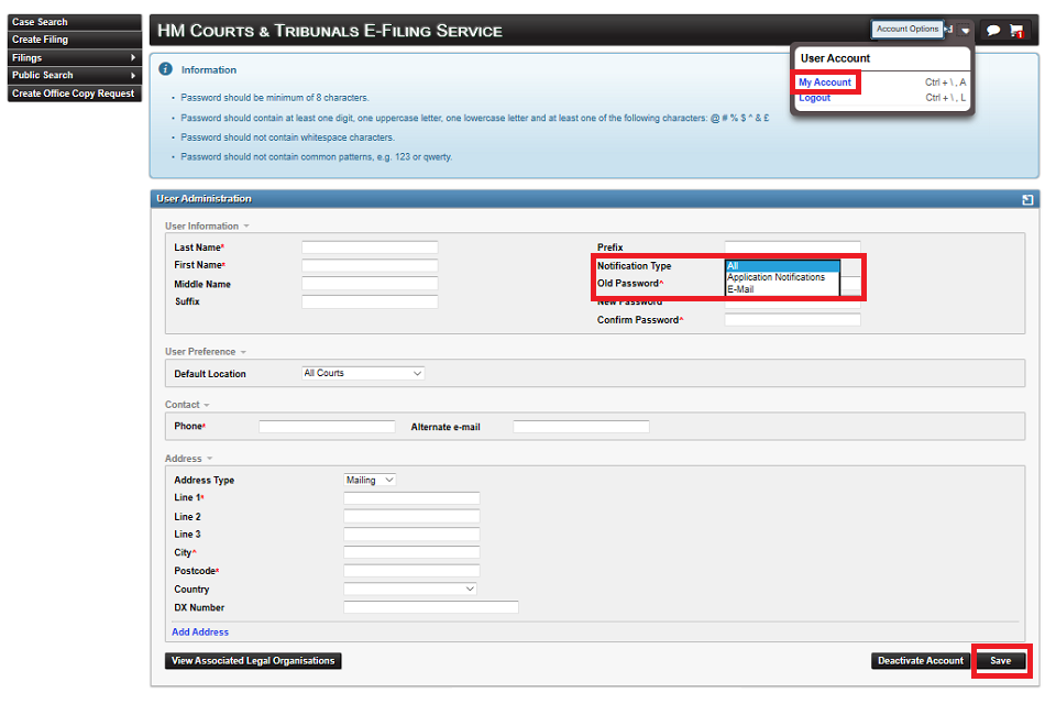 5. If you are a barrister or counsel you can use ‘Barrister Chambers’ in ‘Type of User Account’. You will have access to submit filings but will not be able to access cases – these will be for your instructing solicitors to manage.