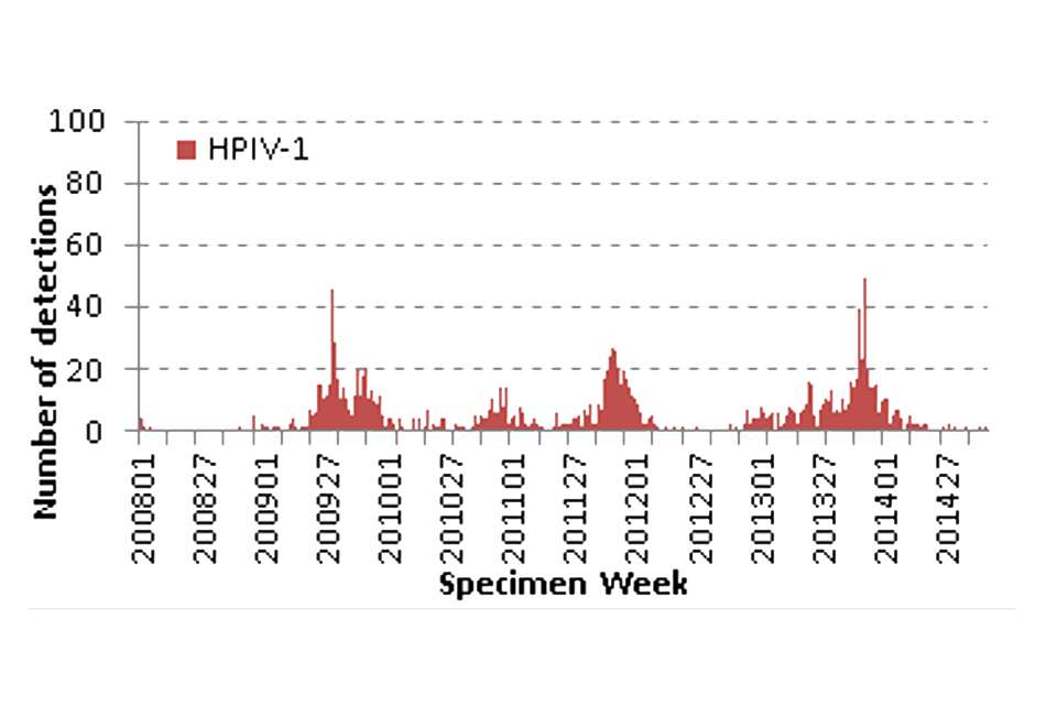 Weekly distribution of human parainfluenza type 1 (HPIV-1) reports (by specimen week and virus type) in England and Wales, from 2008 to 2014