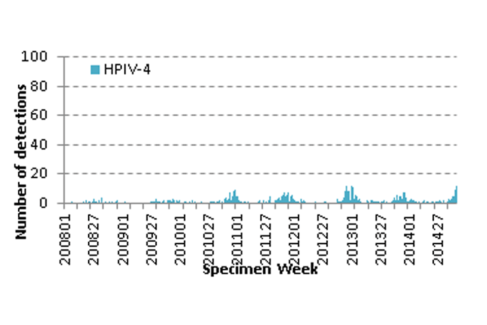 Weekly distribution of human parainfluenza untyped (HPIV-4) reports (by specimen week and virus type), in England and Wales from 2008 to 2014