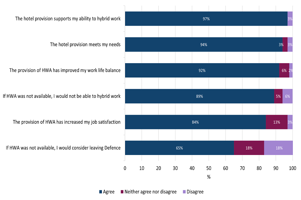 The MOD Accommodation Analysis Team therefore conducted an online survey with SP who were part of the trial to understand their experiences of HWA. 66 responses were received. The survey findings have been used to inform and shape decisions on the future design of Hybrid Working Accommodation (HWA) policy.