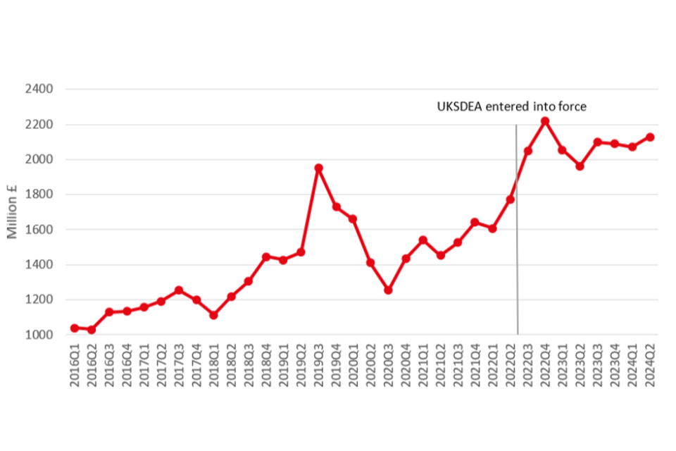 Since the UKSDEA came into effect on 14 June 2022, the UK’s services exports to Singapore increased in the following two quarters (Figure 2), potentially showing an initial positive impact of the agreement although difficult to pinpoint exact attribution. Changing global economic conditions, industry-specific challenges, and market dynamics, all play a role in influencing services exports.