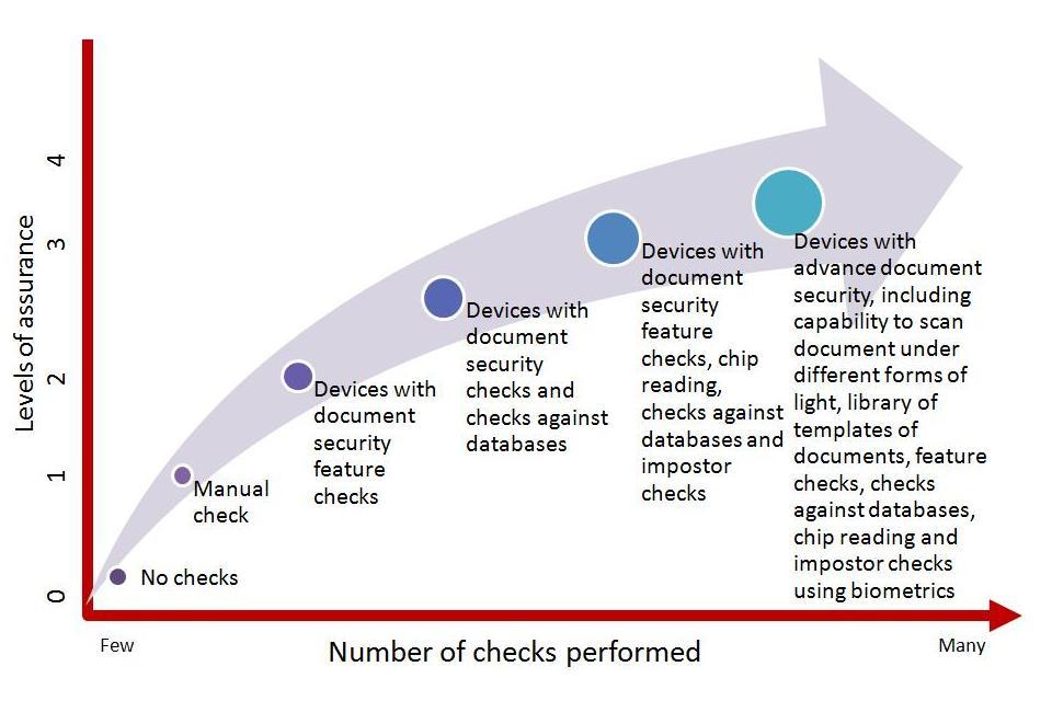 | 3 | Assurance based on beyond reasonable doubt. | Conducts many checks on identity document security features. Compares a scan of an identity document against an identity document template library. Opens and inspects a chipped document. Conducts checks against a range of other data sources. Undertakes impostor checks. | Where there is a need to protect vulnerable people, such as children or the elderly. Where employers need to ensure their employees are trustworthy, e.g. contract cleaners and security staff. When necessary to protect a business’s or organisation’s reputation. |