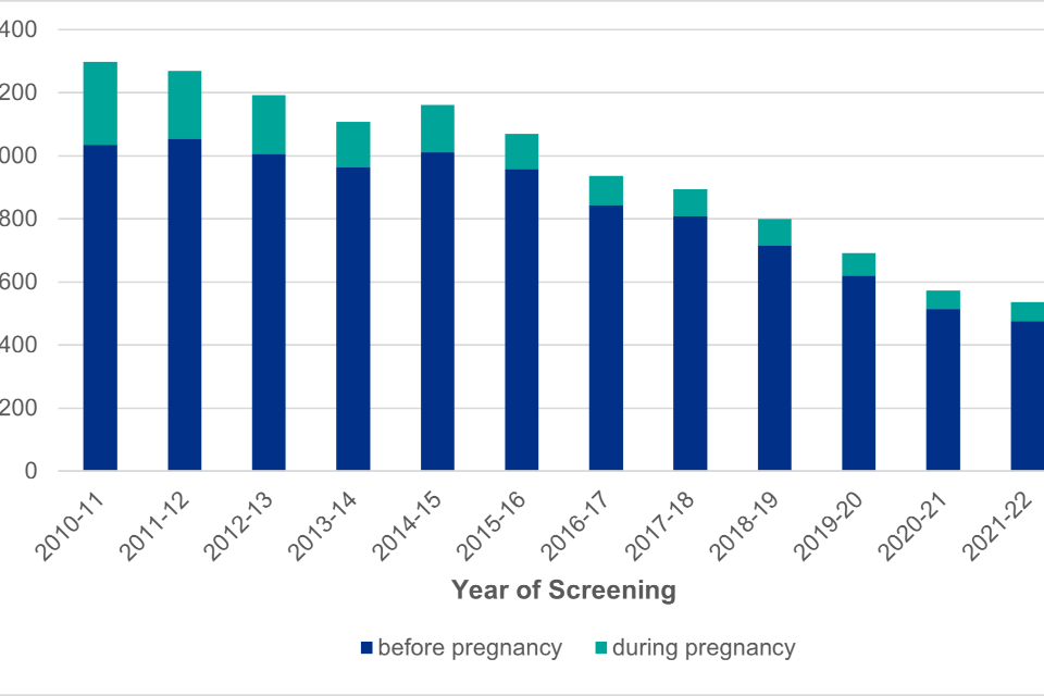 There were 536 pregnancies in women living with HIV with a booking date in the 2021-22 screening year, showing a slight decline from 574 pregnancies booked in the 2020-21 screening year. Women with a diagnosis of HIV prior to conception made up 89.0% of pregnancies (477/536). The remaining women were diagnosed during their current pregnancy, with the majority (87.5%) because of the screening programme. The proportion of women with a known HIV diagnosis before pregnancy has increased by approximately 10% in the last 10 years (79.7% in 2010 to 2011) (see figure 1).
