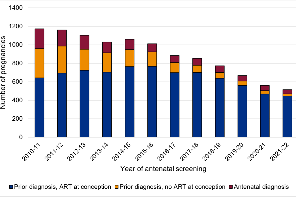 This report focuses on pregnancies to women living with HIV who booked for antenatal care in England from 1 April 2021 to 31 March 2022. All HIV screen positive pregnancies reported to ISOSS with data submitted by the end of September 2023 are included; this includes pregnancies in women with established HIV diagnosis as well as those newly diagnosed through antenatal screening. Data around vertical transmissions also include women who were diagnosed with HIV after delivery. Data presented on vertical transmissions, breastfeeding and trends includes pregnancies reported in previous years.