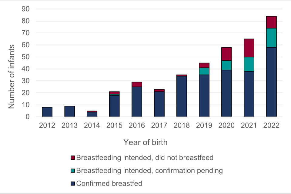 A small but increasing number of women living with HIV are choosing supported breastfeeding over formula feeding, most of whom were born abroad and diagnosed before pregnancy. No transmissions have been reported to date where breastfeeding has been supported, although breastfeeding or follow-up was still ongoing for a number of infants at the time of analysis.
