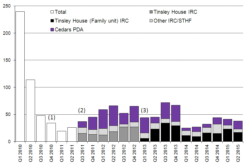 (2) Cedars PDA opened on 17 August 2011. From the third quarter of 2011, all child detainees in Tinsley House are shown in Tinsley House IRC. From January 2013 child detainees in Tinsley House IRC, as part of a family, are shown in Tinsley House (Family Unit) IRC; the remainder are shown in Other IRC/STHF.