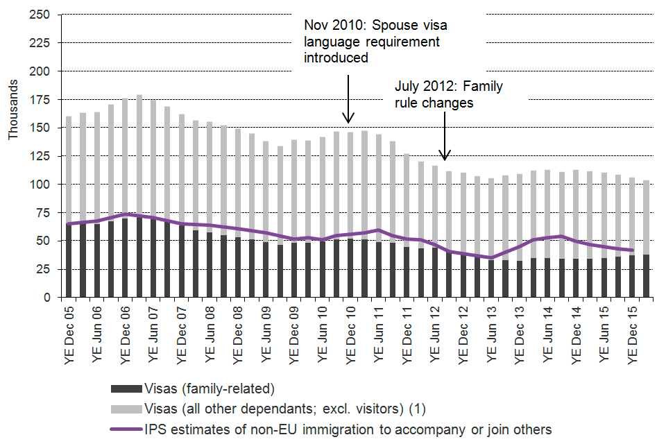 In the year ending December 2015 (the latest provisional data available), estimates from the International Passenger Survey (IPS) showed that 42,000 non-EU nationals immigrated long-term to the UK to accompany or join others, that is with the intention of staying for a year or more. This was an 8,000 decrease from 50,000 in the previous 12 months. Those arriving to accompany or join are not directly comparable with visa categories but will include both family-related migration and potentially dependants of other migrants, as explained below.