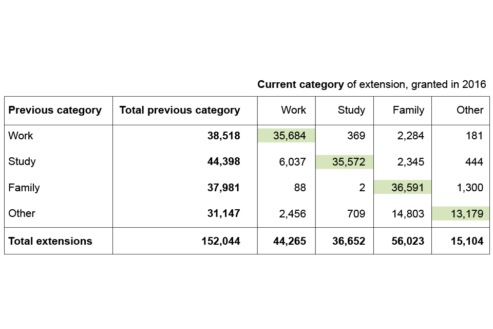 There were 152,044 main applicants granted an extension to their stay in 2016; 121,026 (80%) allowed the individual to stay within their original broad category (e.g. students continuing to study), with the other 20% having switched categories (e.g. Tier 4 students switching to work).