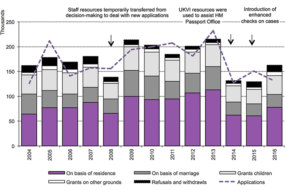 Source: Home Office, Immigration Statistics January to March 2017, Citizenship tables cz 02 and cz 03. In 2008 staff resources were temporarily transferred from decision-making to deal with new applications. In 2014 UK Visas and Immigration (UKVI) resources were used to assist HM Passport Office. In 2015 enhanced checks on cases were introduced.