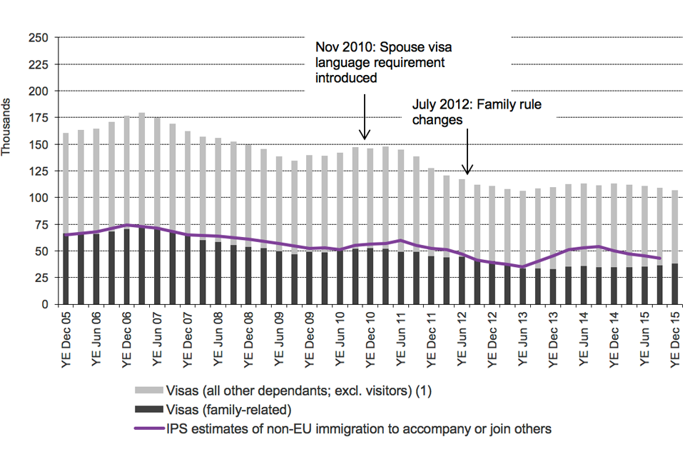 In the year ending September 2015 (the latest provisional data available), estimates from the International Passenger Survey (IPS) showed that 43,000 non-EU nationals immigrated long-term to the UK to accompany or join others, that is with the intention of staying for a year or more. This was an 11,000 decrease from 54,000 in the previous 12 months. Those arriving to accompany or join are not directly comparable with visa categories but will include both family-related migration and potentially dependants of other migrants, as explained below.