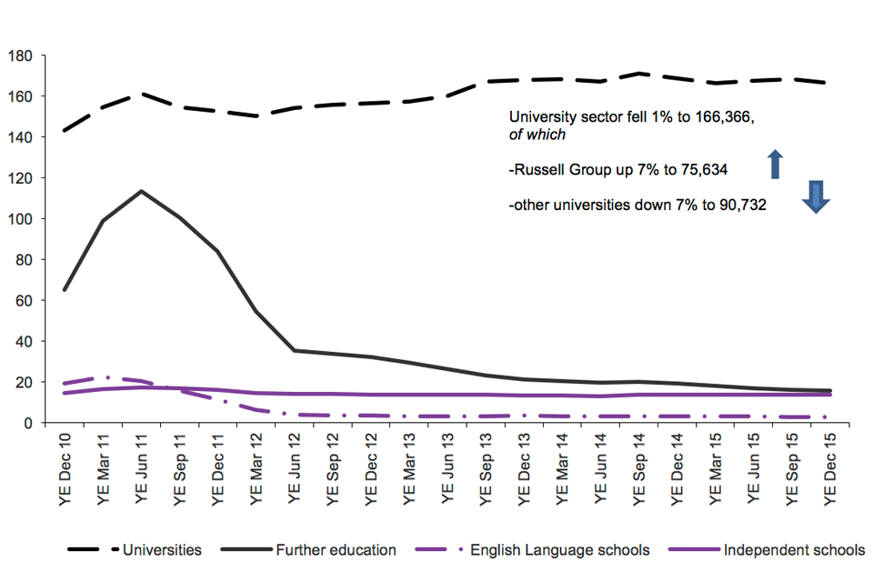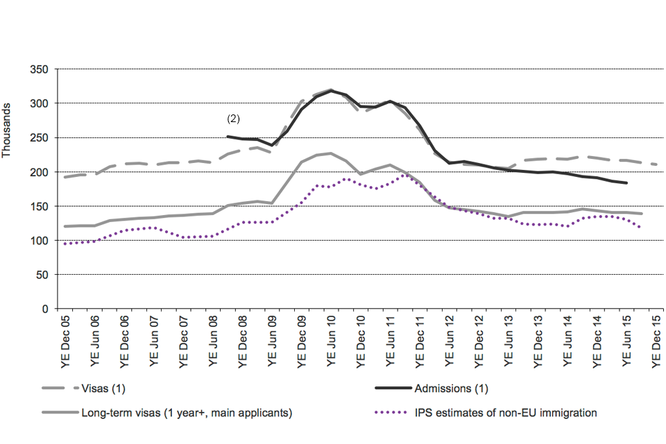Source: Home Office, Immigration Statistics October to December 2015 Visas table vi 04, vi 06 q s, International Passenger Survey, Office for National Statistics Migration Statistics Quarterly Report.