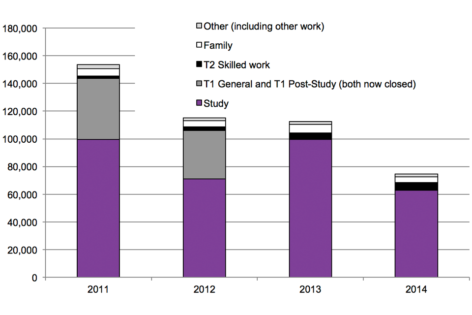 The fall in grants of extensions of stay is likely to reflect previous falls in the numbers granted visas, particularly to applicants in further education, together with tightening of the rules such as the new use of the “genuineness” test for study (Tier 4) extensions of stay, announced on 6 September 2013 ‘Statement of Changes in Immigration Rules’.