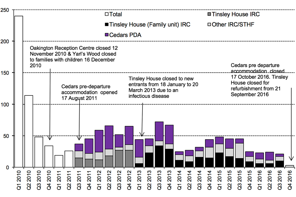 From the third quarter of 2011, all child detainees in Tinsley House are shown in Tinsley House IRC. From January 2013 child detainees in Tinsley House IRC, as part of a family, are shown in Tinsley House (Family Unit) IRC; the remainder are shown in Other IRC/STHF (short-term holding facilities).
