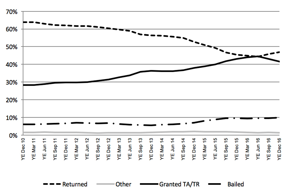After a steady decline from 64% in the year ending March 2011 to 44% in year ending June 2016, in the proportion of detainees being returned or voluntarily departing the UK on leaving detention the figure has climbed back to 47% in the year ending December 2016. Conversely, over the same period, the proportion of detainees granted TA/TR have increased from 28% to 45% and then declined to 42%. The proportion of detainees granted bail has increased from 6% to 10%.
