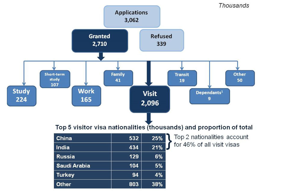 There were over 2.7 million visas granted in 2017. Of these, nearly 2.1 million (77%) were to visit and 8% were for study.