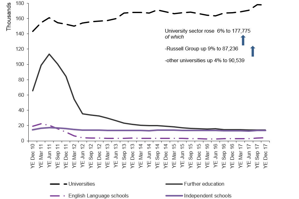 Over the same period, the number of University-sponsored study visa applications rose 6% to 177,775. This included a 9% increase for Russell Group universities to 87,236.