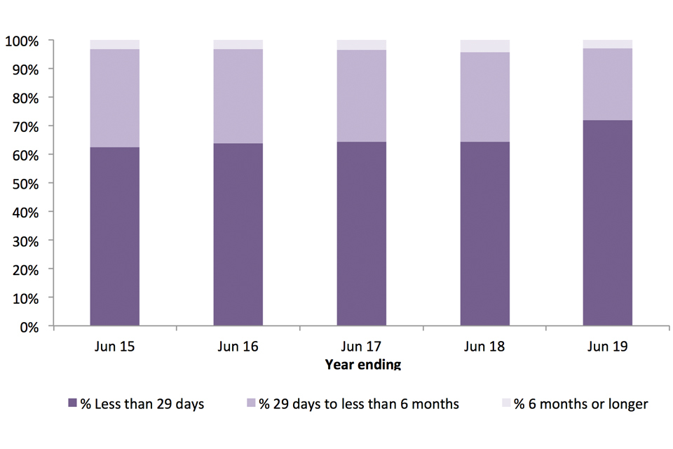 In the year ending June 2019, 24,467 left the detention estate (down 11%). 72% of these were detained for less than 29 days and 3% were detained for more than 6 months. The Home Office would usually only detain someone for more than 6 months if they are a foreign national offender (FNO), or if they have subsequently claimed asylum while in detention.