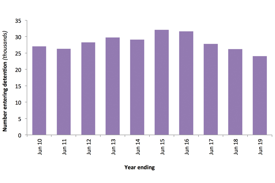 In the year ending June 2019, 24,052 individuals entered the detention estate, 8% fewer than the previous year. This represents a fall for the fourth consecutive year to the lowest level since comparable records began in 2009.