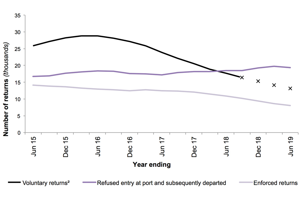 - ‘Voluntary returns’ are subject to significant upward revision (particularly for the last 12 months, shown as crosses in the chart) as matching checks are made on travellers after departure. They include a variety of departures, including assisted voluntary returns, controlled returns and other verified returns (for example, through data matching). Provisional data are denoted with an ‘X’ in the chart.