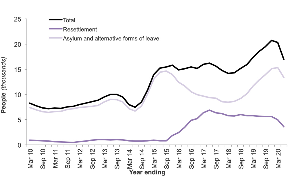 The UK offered protection – in the form of asylum, humanitarian protection, alternative forms of leave and resettlement – to 16,952 people in the year ending June 2020, 8% lower than the previous year, although higher than levels seen prior to 2019.