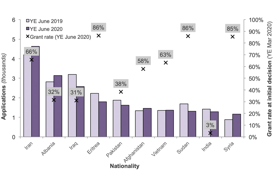 Iran was the top nationality claiming asylum in the UK in year ending June 2020 (4,627 applications, up 10% compared with the previous year), followed by Albania (3,134, up 11%). About two thirds (66%) of applications from Iranian nationals were granted at initial decision, compared to around a third (32%) of those from Albanians – although additional numbers may be granted following appeal (see section 3 below).