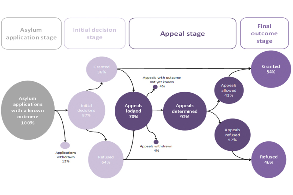 Data from the Home Office ‘cohort’ analysis, published annually in Asy_D04, show that the final grant rate typically increases by 10 to 20 percentage points following appeal. More detailed analysis can be found below in section 3 relating to the outcome of asylum applications.