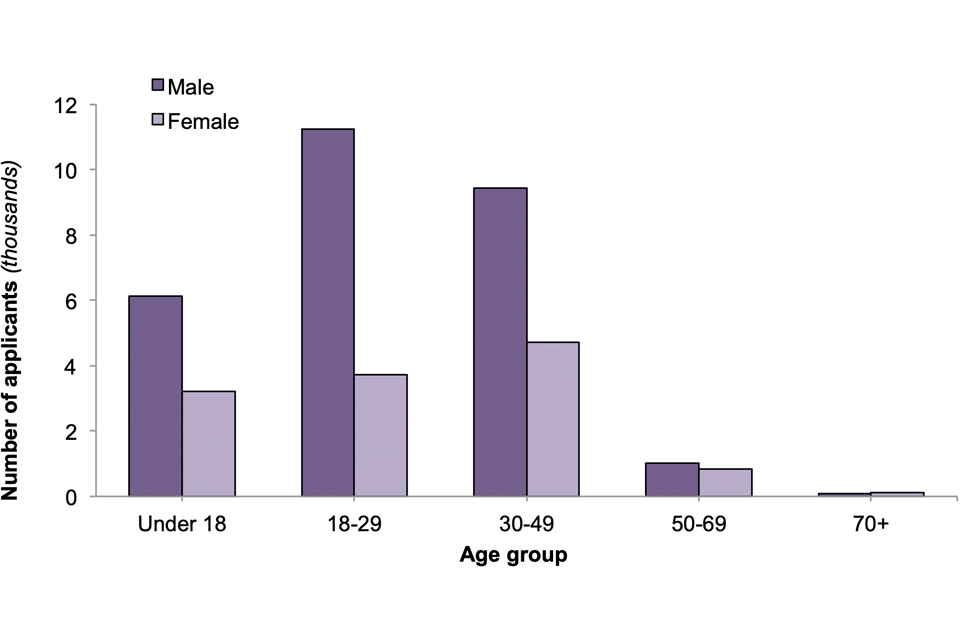 Of the 32,423 asylum applications, 44% of main applicants were aged 18 to 29, and a further 10% were children, meaning that around 46% were aged 30 years or over. The age of asylum applicants varied by nationality. For example, 33% of Afghan and Vietnamese main applicants were children (under the age of 18), which will in part reflect the high numbers of UASCs from these two nationalities, compared to 2% of Pakistani main applicants.