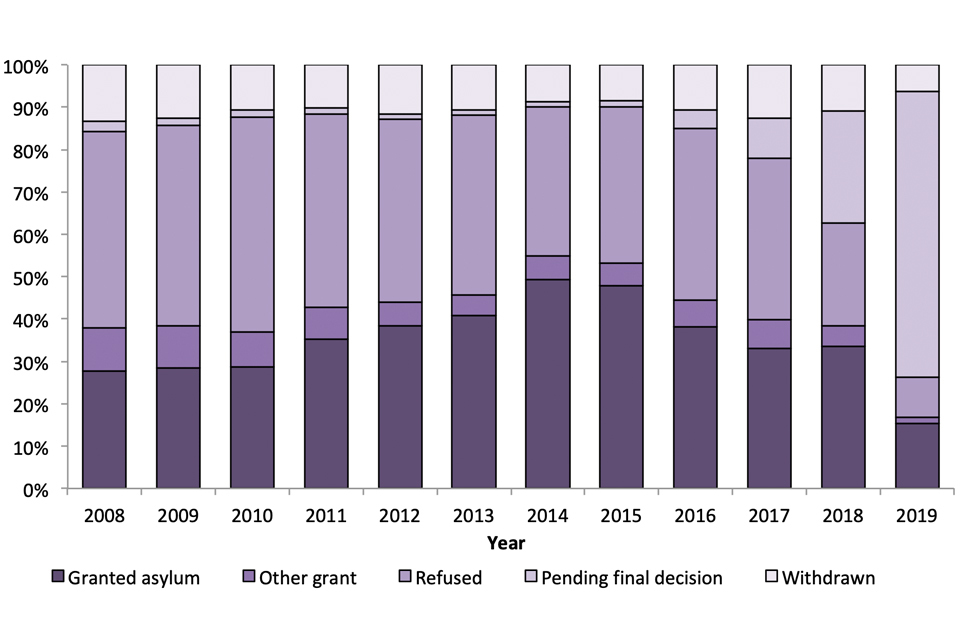 The chart shows the latest outcome of asylum applications made between 2008 and 2019, as at May 2020.