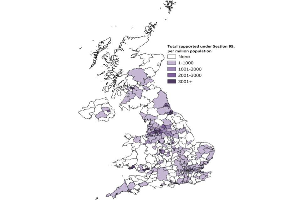 Section 95 support is provided to destitute asylum seekers until their claim is finally determined, which may encompass either accommodation or subsistence, or both. ‘Invalid applications for support and support type not yet known’ are cases that have been deemed invalid or which have not yet been assessed.