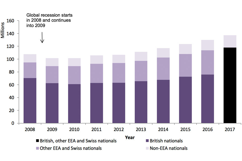 - 3.1 million more arrivals by British, other EEA and Swiss nationals (up 3% to 118.0 million)
