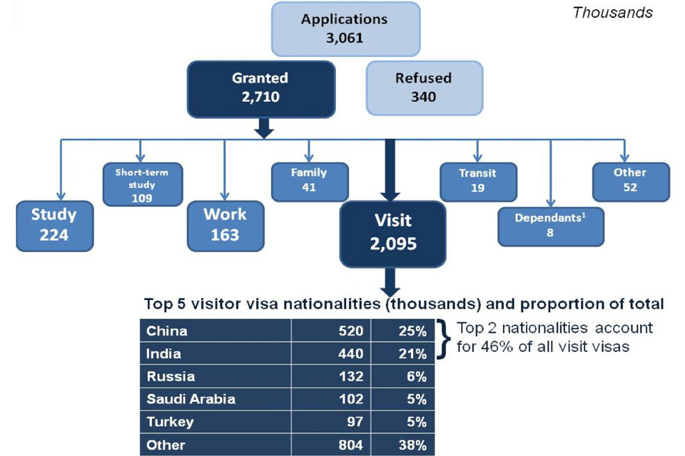 The majority of non-EEA visitors do not require a visa. For other visitors and for other purposes, there were over 2.7 million visas granted in the year ending March 2018. Of these, nearly 2.1 million (77%) were to visit and 8% were for study.