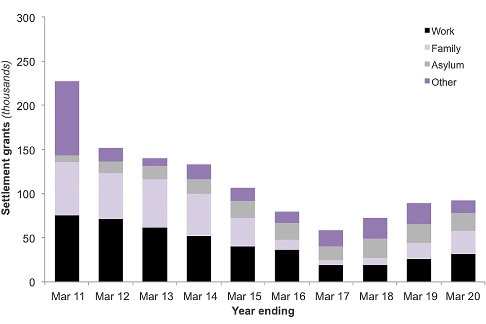Figure 1: Grants of settlement in the UK, by reason1, years ending March 2011 to March 2020