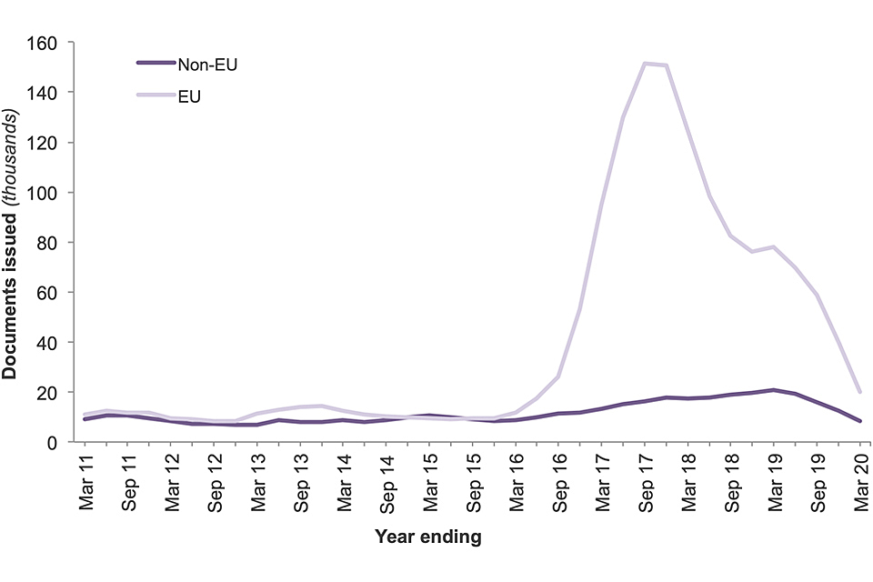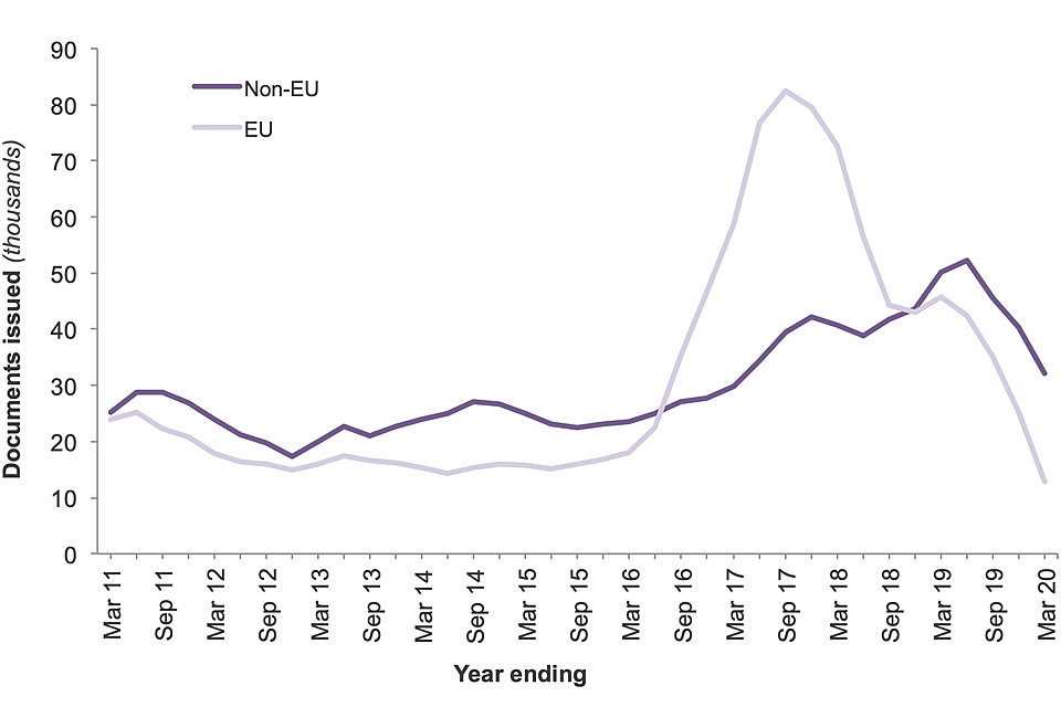 Documents issued to non-EU nationals had gradually increased from March 2017 to March 2019 but the number fell by 59% to 8,510 in the year ending March 2020.