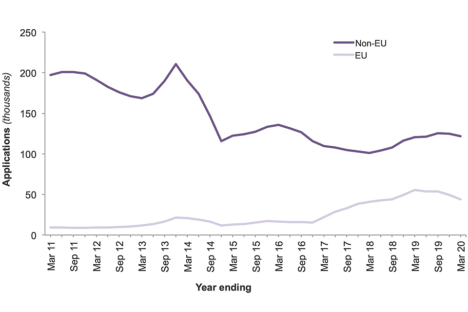 Applications made by non-EU nationals increased by 1% in the year ending March 2020 to 121,615.