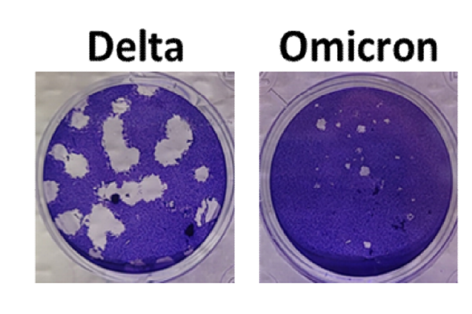 Two photos showing the results of the plaque assay; culture plates of Vero cells inoculated with either the Delta or Omicron variant of SARS-CoV-2 and stained with crystal violet, which stains only living cells.