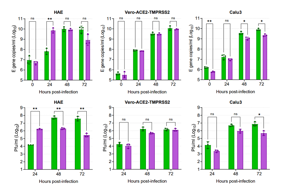 - for Calu3 E gene copies per ml for 48 hours and 72 hours and for Pfu per ml for 72 hours the P is less than 0.05.