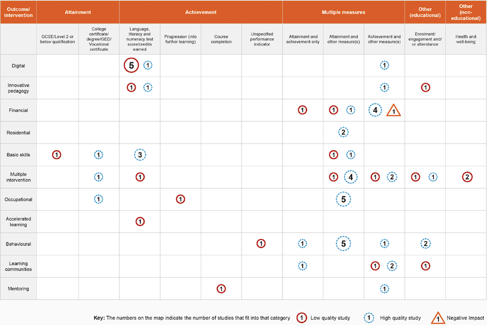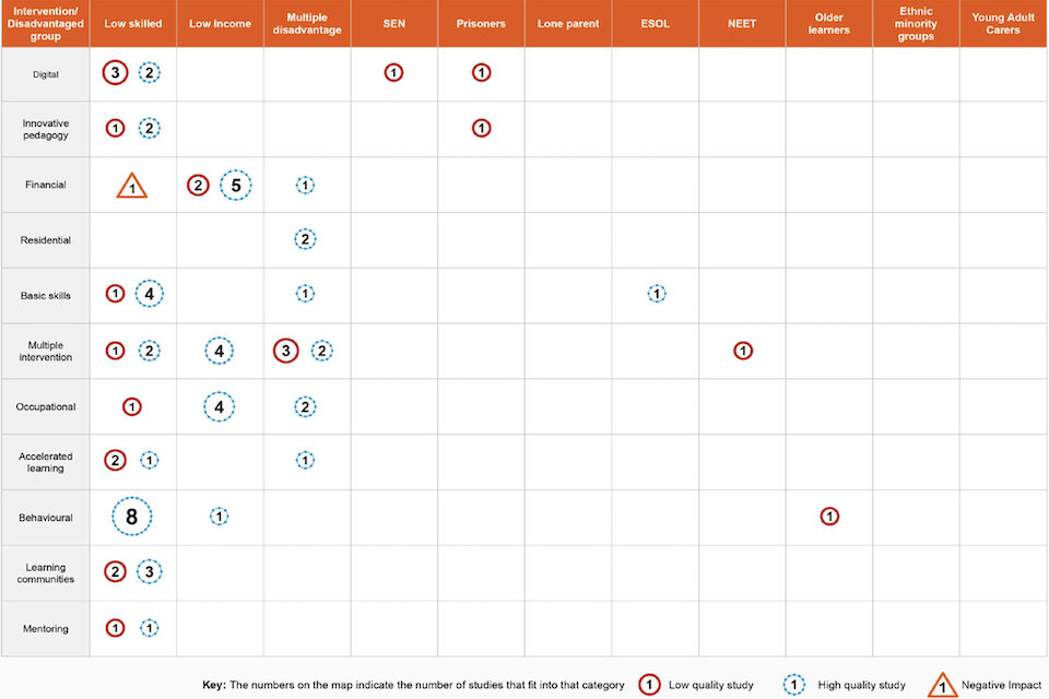 Overall, the evidence on what types of intervention work to support disadvantaged learners is mixed. Much of the evidence included in this review suggests that different programme types have mixed outcomes. However, the most effective programmes appear to be those which offer comprehensive support and those that integrate with course curriculum (for example, embedding basic skills provision in a vocational pathway).