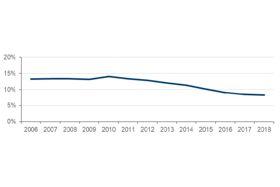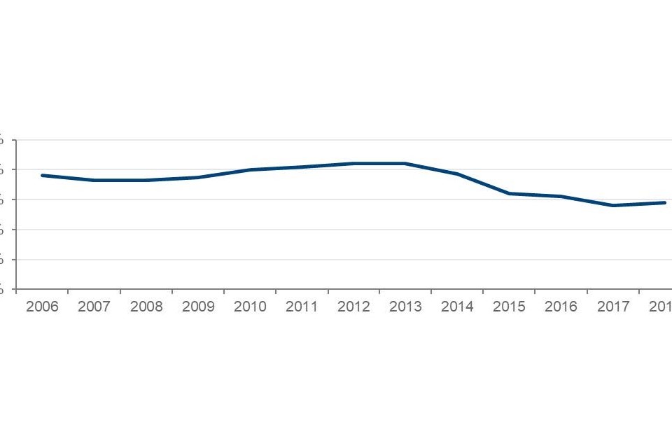 Proportion of young people aged 18 to 24 who have not been in employment or full-time education for two years or more (UK), 2006 to 2018