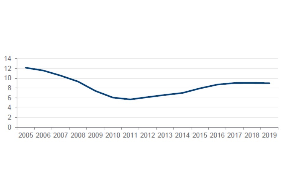 Households with dependent children living in temporary accommodation per 1,000 households (England), 2005 to 2019