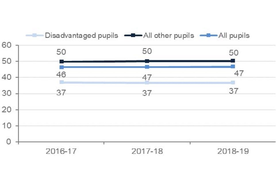 Attainment at key stage 4 has remained constant for all three groups of pupils, at 50 for other pupils, 37 for disadvantaged pupils and 47 for all pupils.