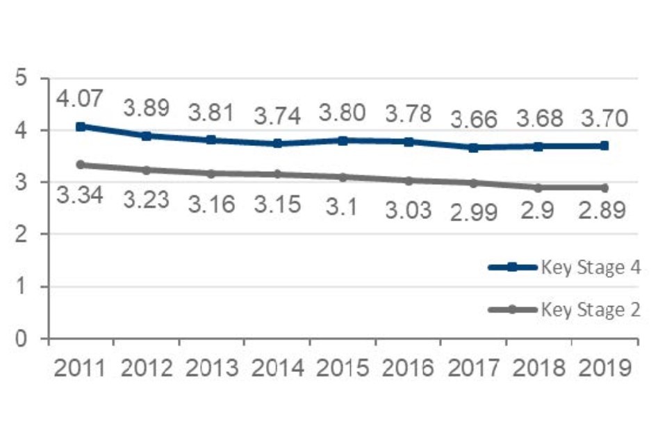 The attainment gap index at key stage 4 was 3.7 in 2019, and 2.89 at key stage 2. These have both fallen from peaks in 2011.