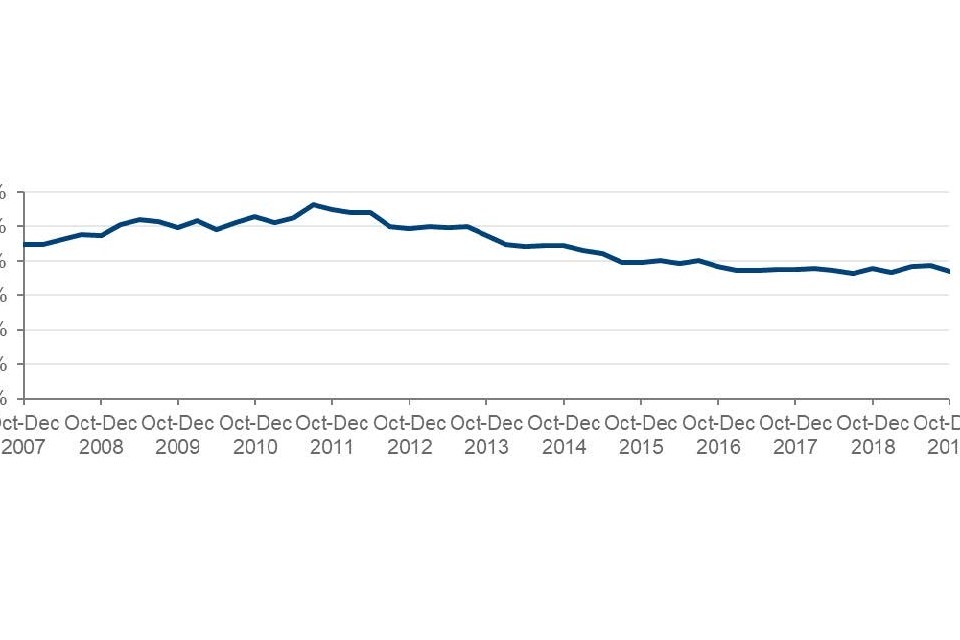 Proportion of young people (aged 16 to 24) who are not in education, employment or training (NEET) (UK), 2007 to 2019
