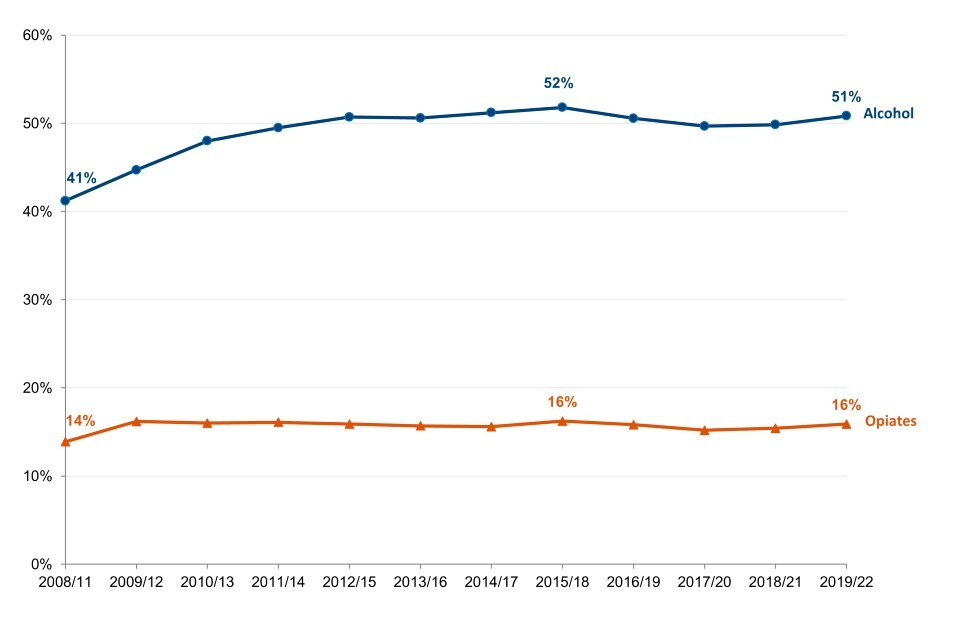 Proportion of alcohol dependent or opiate using parents who have entered and completed treatment within the last three years (England), 2008 to 2022