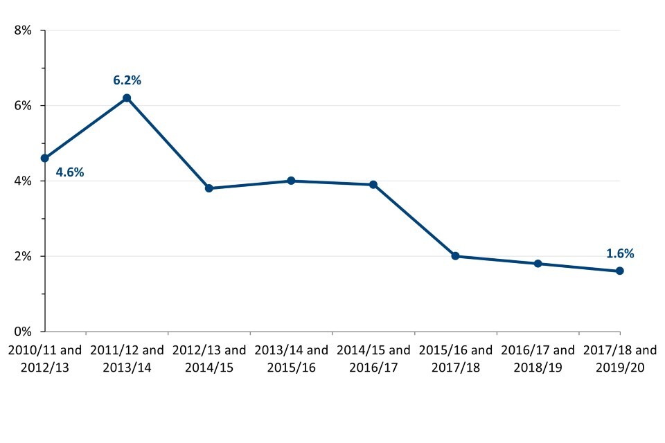 The proportion of children living in households in persistent problem debt fell to 1.6% from 1.8% in the most recent 2-year period. It is well below its peak of 6.2% in 2011/12 and 2013/14.